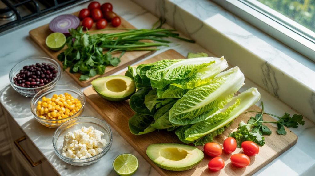 I chop the lettuce, slice the tomatoes, dice the pepper and onion, rinse the beans, and cut the avocado last so it stays fresh.