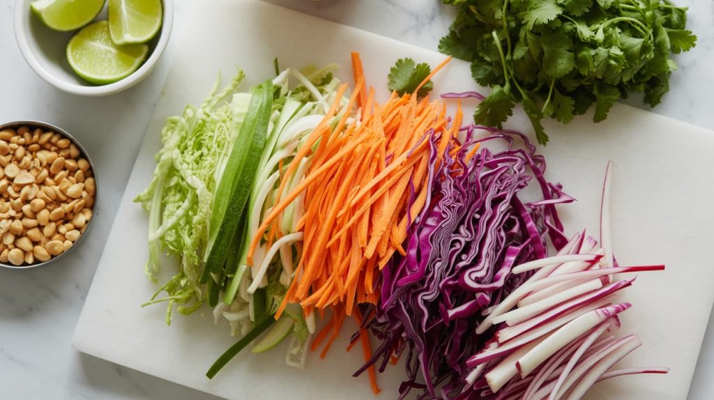 I shred the cabbage, slice the peppers and cucumber thin, and grate the carrots. The goal is thin, crunchy pieces so everything mixes well.